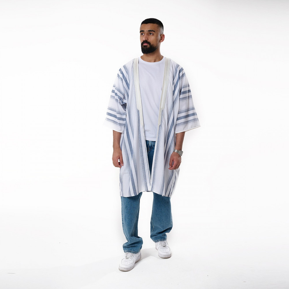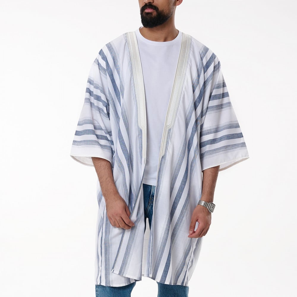 بشت ميني مع تطريز القبة والاكمامقماش لنن خفيفلون القماش ابيض مقلم ازرقلون التطريز ابيضقطعة صيفية كلاسيكصنع بفخر بالمملكة العربية السعودية - الرياض