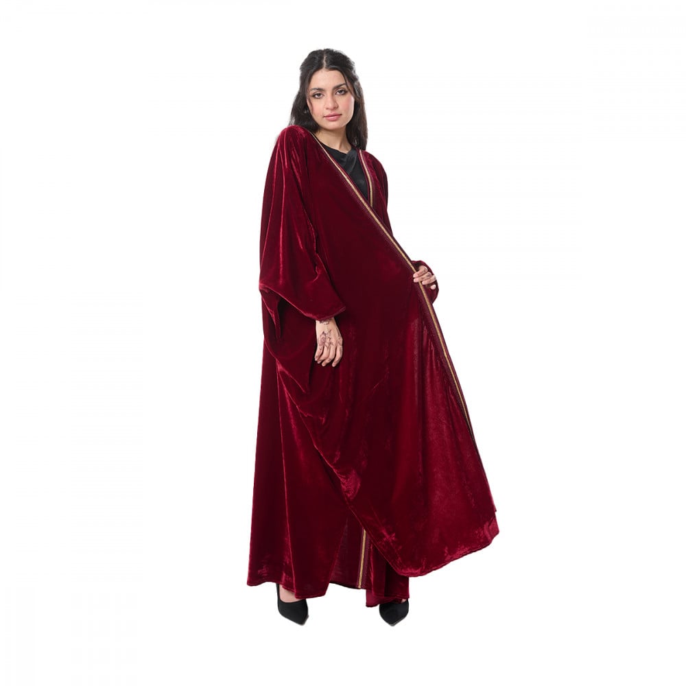 Classic bisht abaya with full embroidery of the dome and sleeves in burgundy and golden buttons
