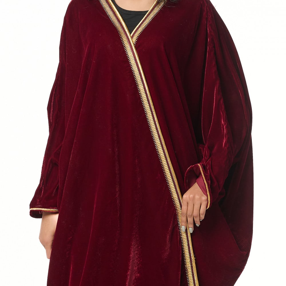 Classic bisht abaya with embroidery on the full dome and sleeves in burgundy and golden buttons