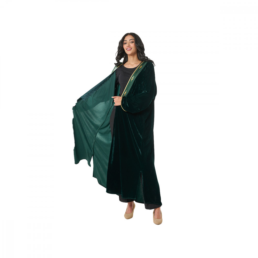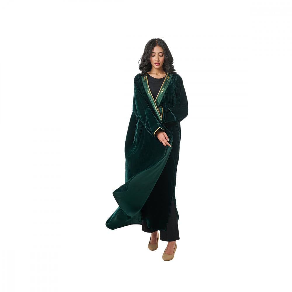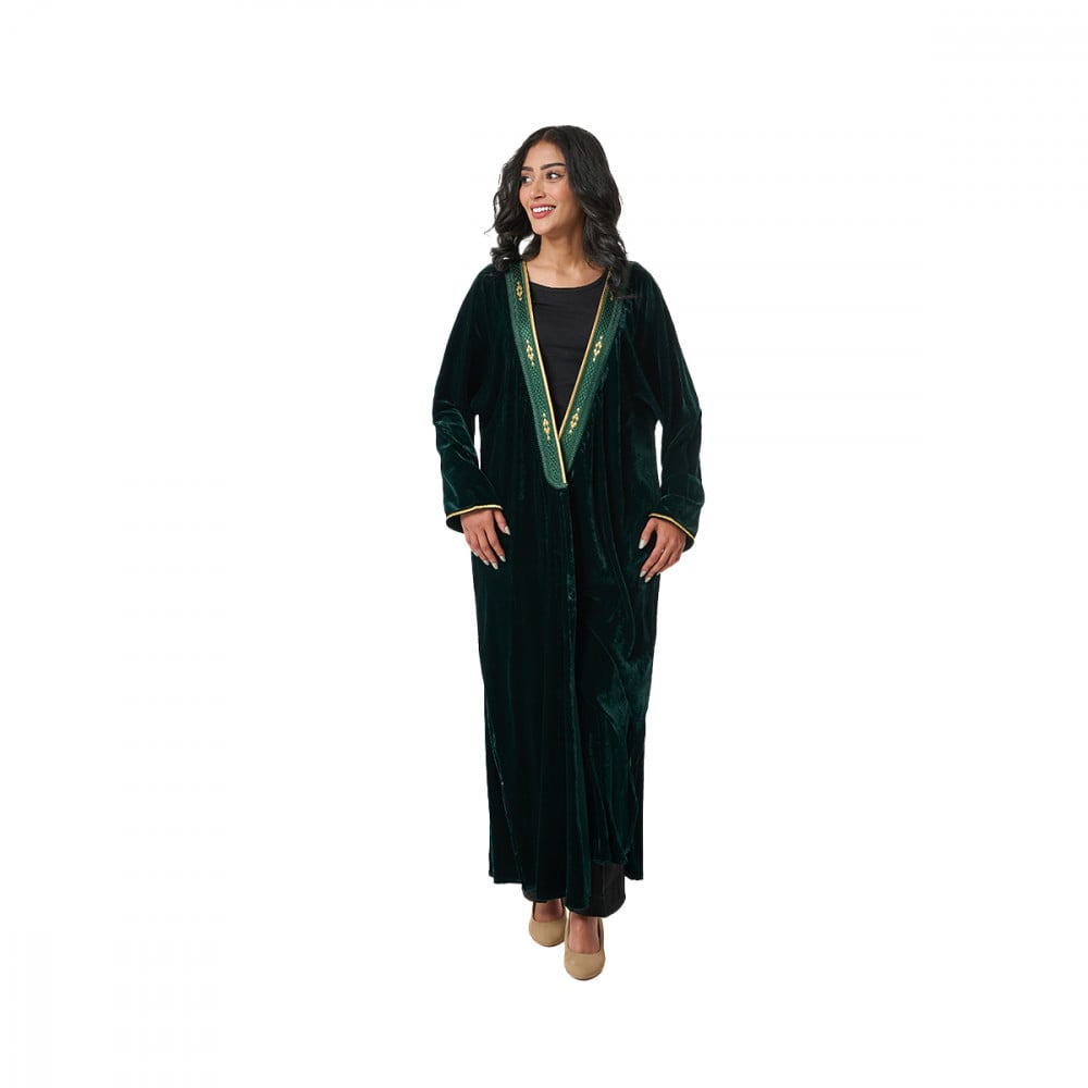 Velvet bisht abaya with full embroidery of the dome and sleeves in green and golden buttons