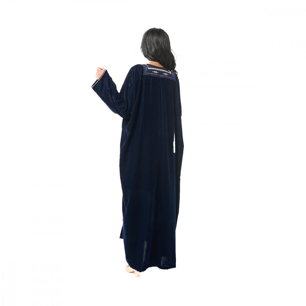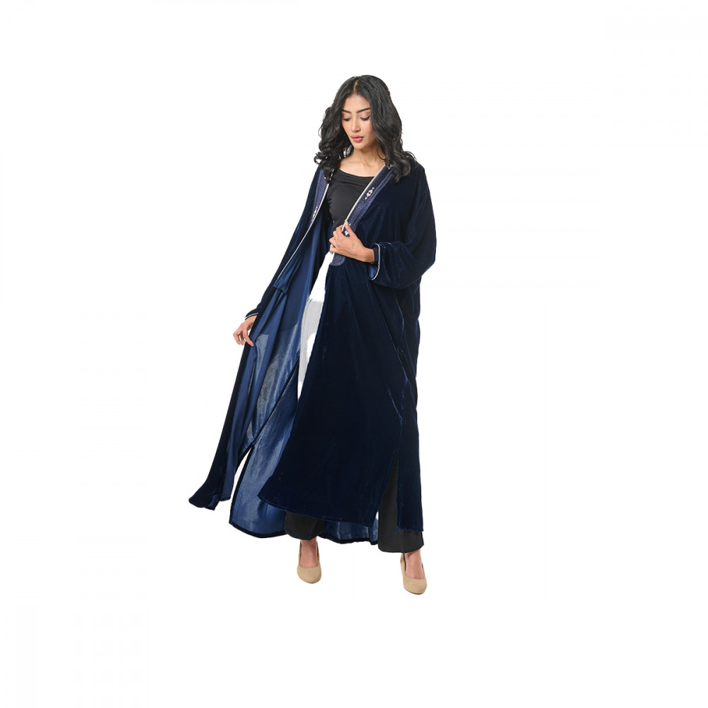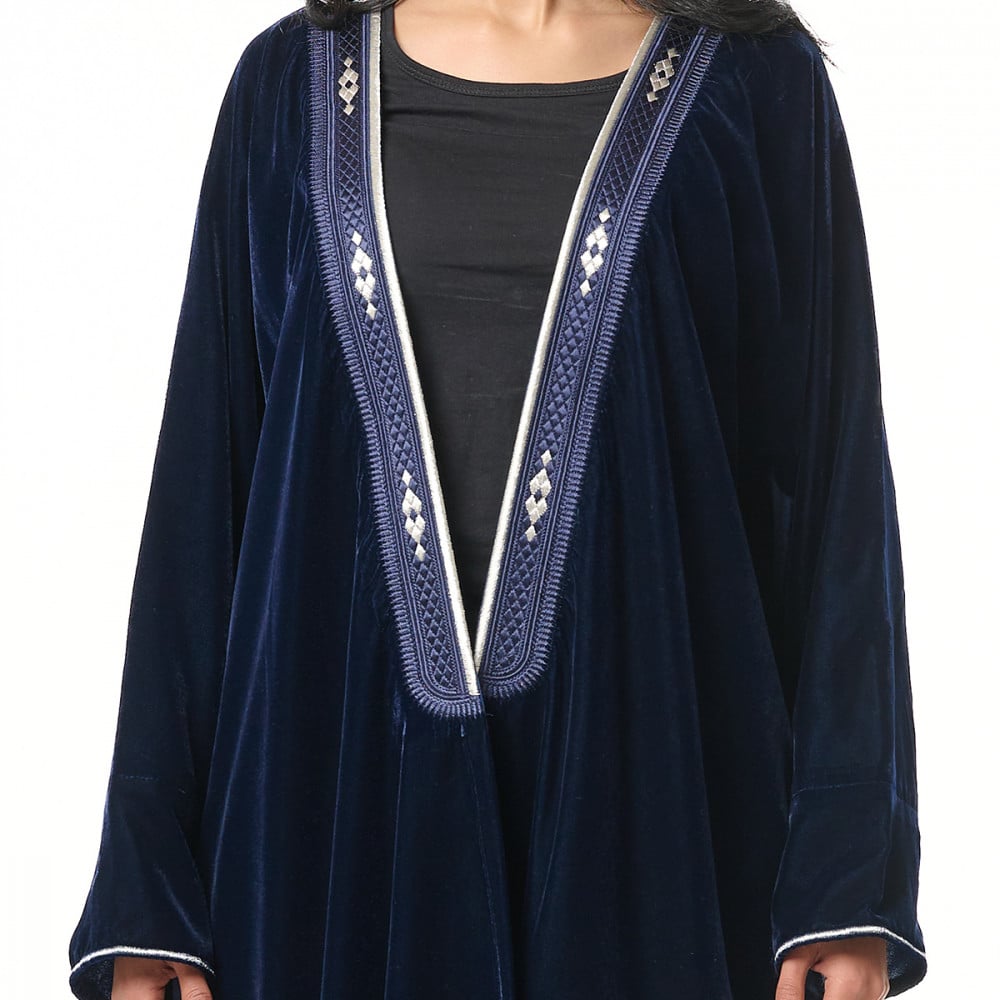 Velvet bisht abaya with full embroidery of the dome and sleeves in navy blue and silver buttons