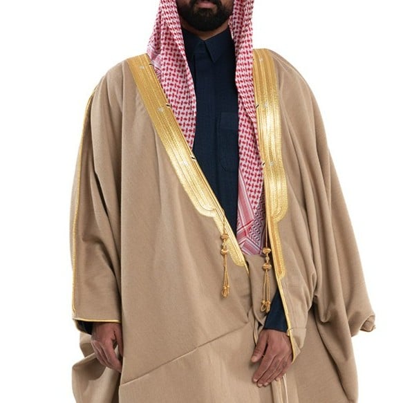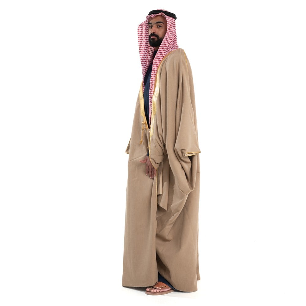A royal bisht and a formal button-down Colour: beige Fabric: soft terry Button colour: gold Proudly made in Saudi Arabia - Riyadh Production of Riyadh Technical Factory for bishout, fur, and ready-made clothing
