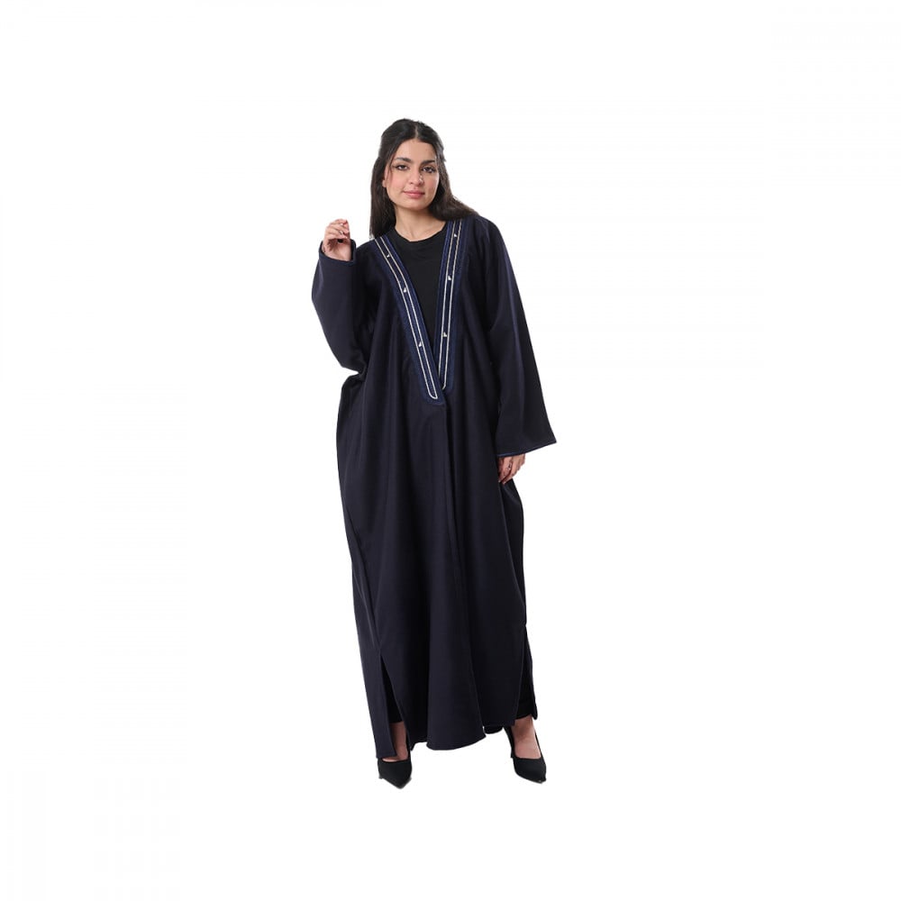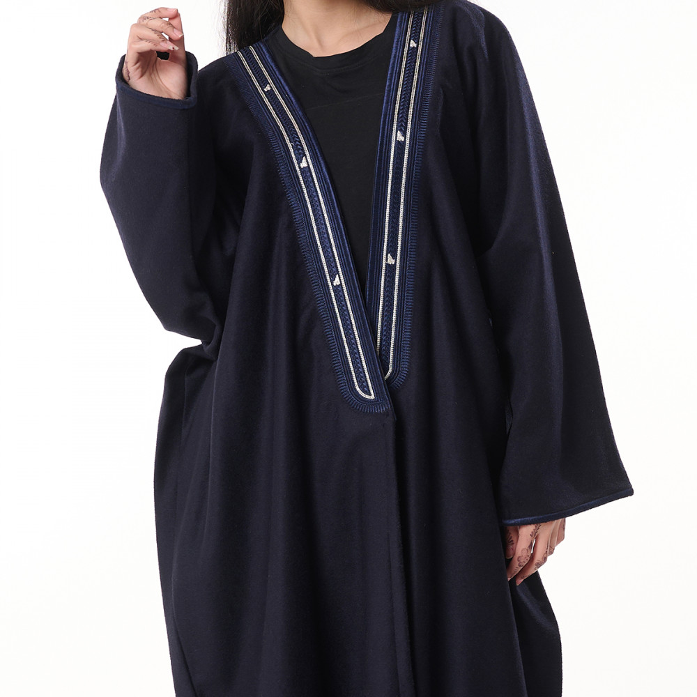 Royal bisht abaya with embroidery on the neckline and sleeves in navy blue and silver buttons