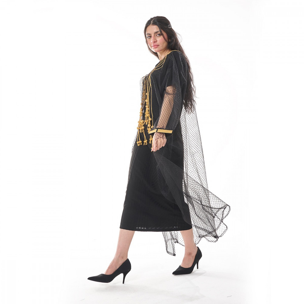 Abaya, royal caitan model, with sleeves embroidery in black and golden buttons