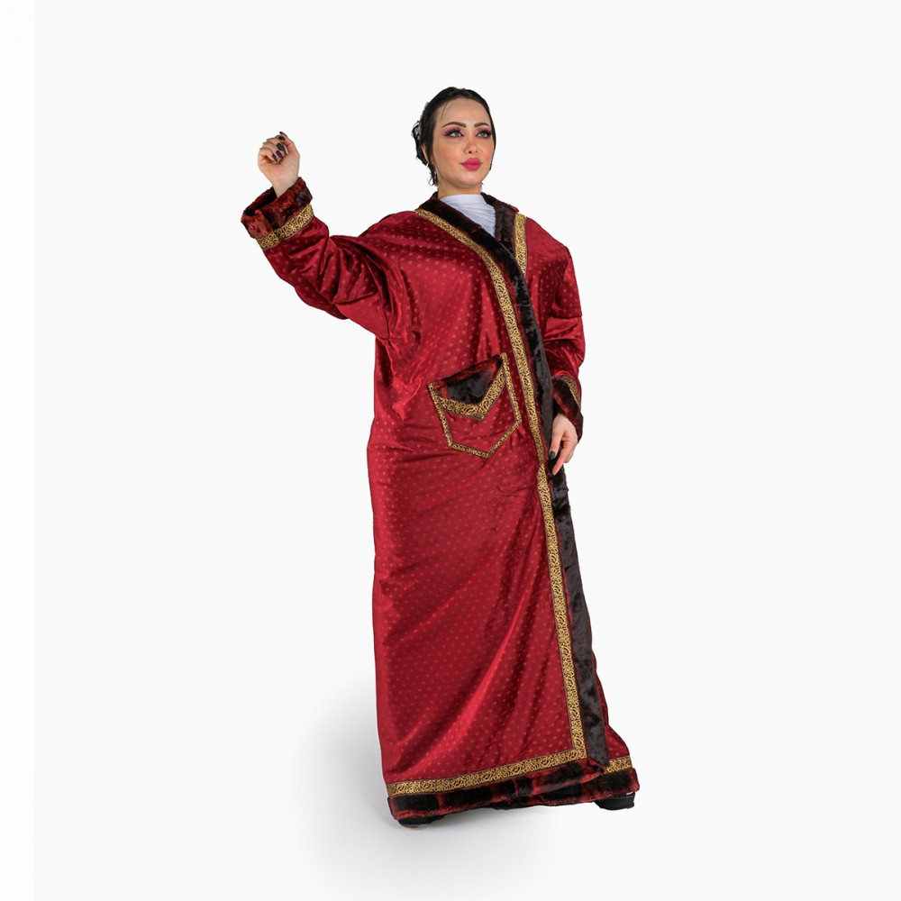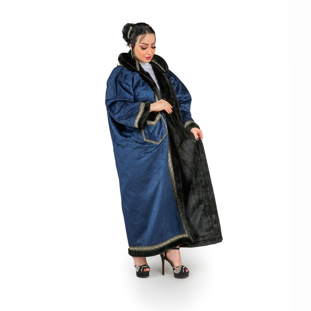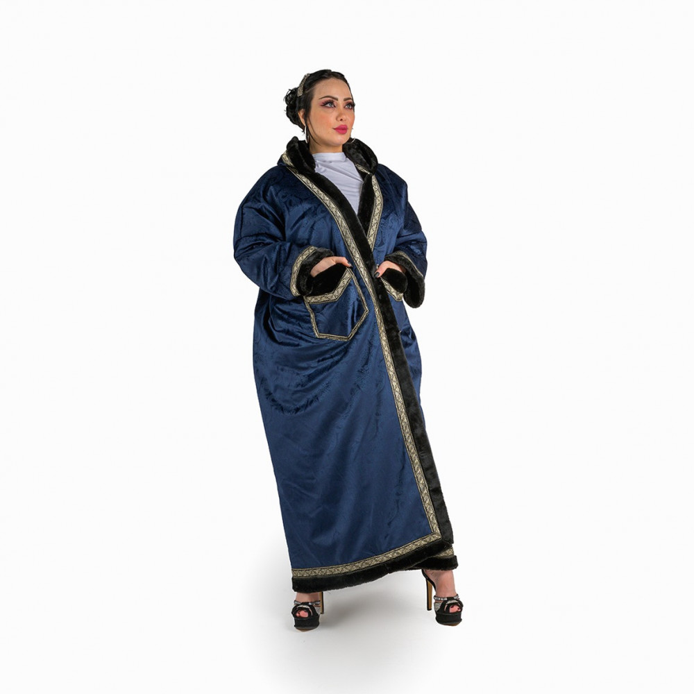 Velvet fur with embroidered tape and pocket Dotted velvet fabric The color of the fabric is navy Premium faux fur The color of the fur is black A special piece for special occasions Proudly made in the Kingdom of Saudi Arabia - Riyadh